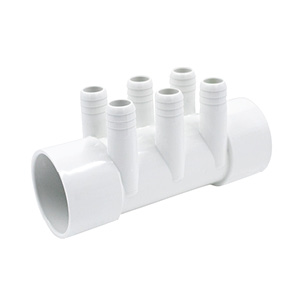 Vattenmanifold i vit PVC 2” inre diameter x 2” inre diameter , 6 anslutningar 3/4” eller 20 mm slang