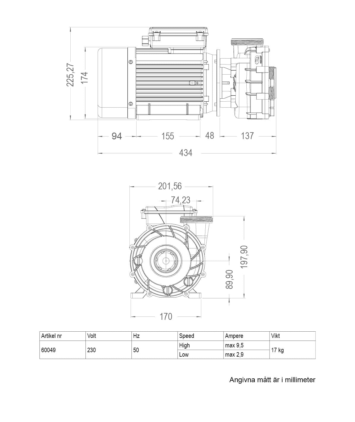 220-240V 50Hz  High speed 2200 kw 9,5A, Low speed 2,9 A