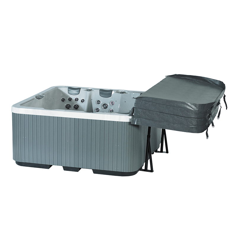 En enklare lockhållare där locket dras ut över armarna. Lockhållaren har plattor som skjuts in under badet för att stå stadigt på plats. När den ej används går armarna att vika in mot spabadets kant.