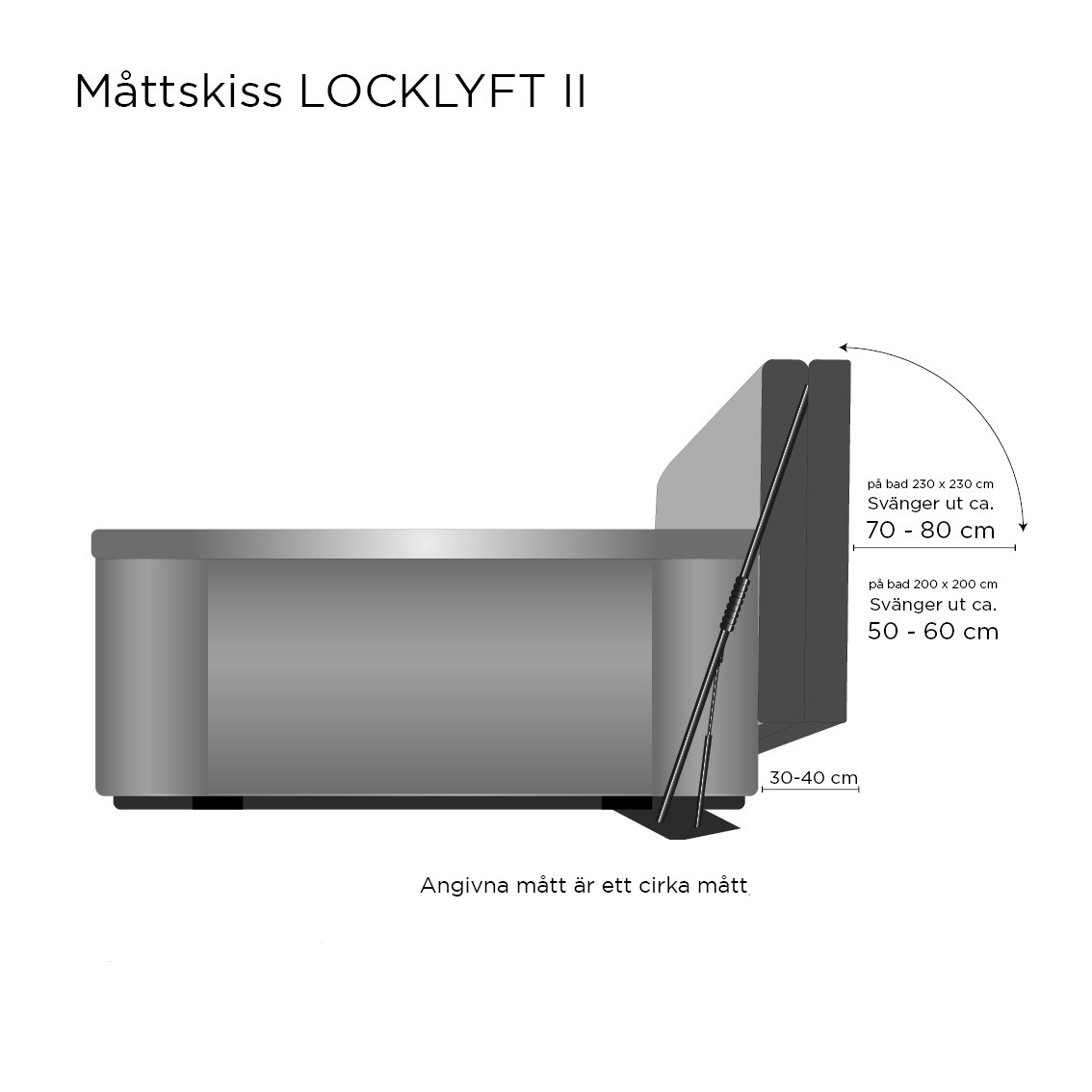 – på spabad 230 x 230 cm svänger det ut ca 70 – 80 cm