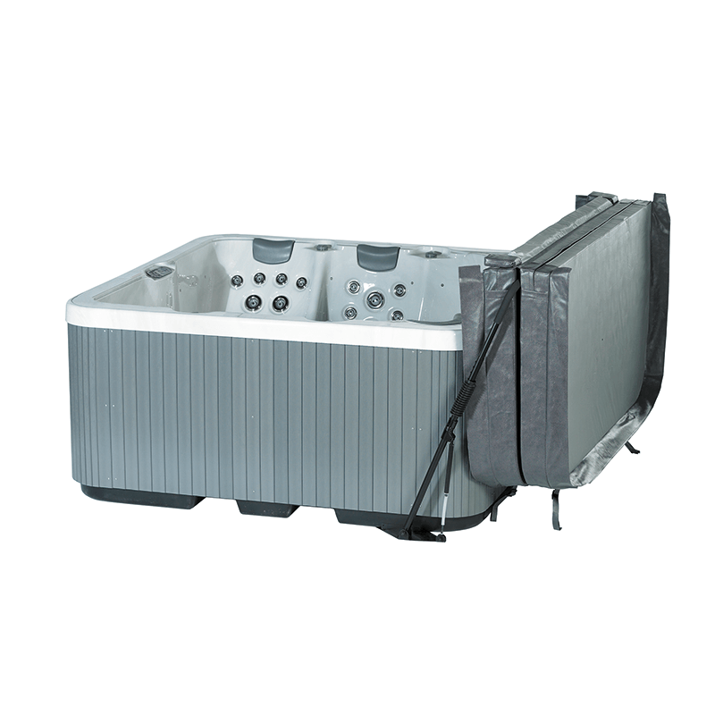 Locklyft som passar bra om ditt spabad står med sidorna fria. Locklyften har plattor som skjuts in under badet för att stå stadigt på plats. När locket ska tas av viks ena halvan över locklyftens arm och tippas sedan bakåt. Locket hänger ner på sidan av spabadet under tiden du badar.