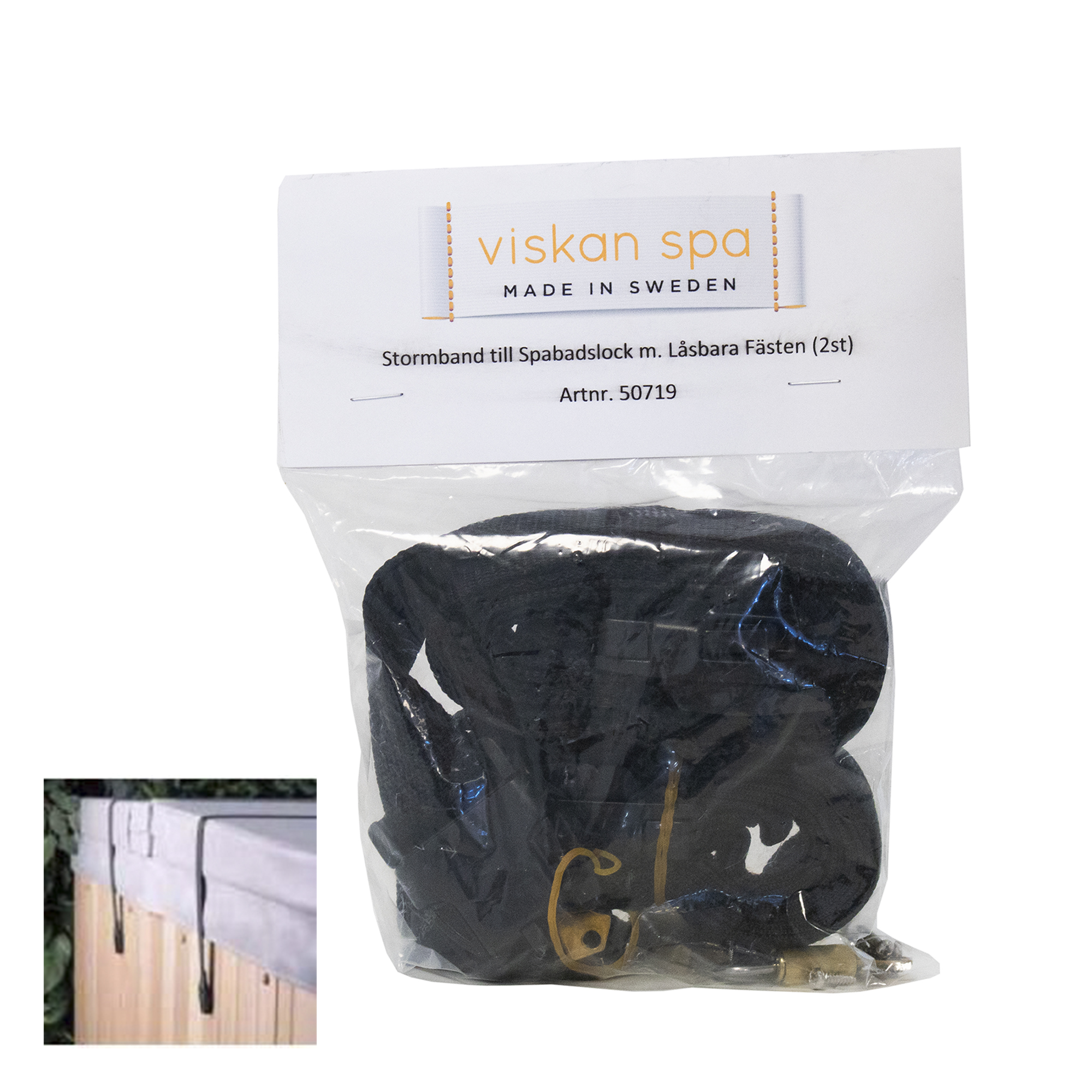 2 st remmar med clips för att dra över locket och förhindra att det blåser av vid kraftig vind. Remmarna är ställbara med maxlängd 2,80 m.